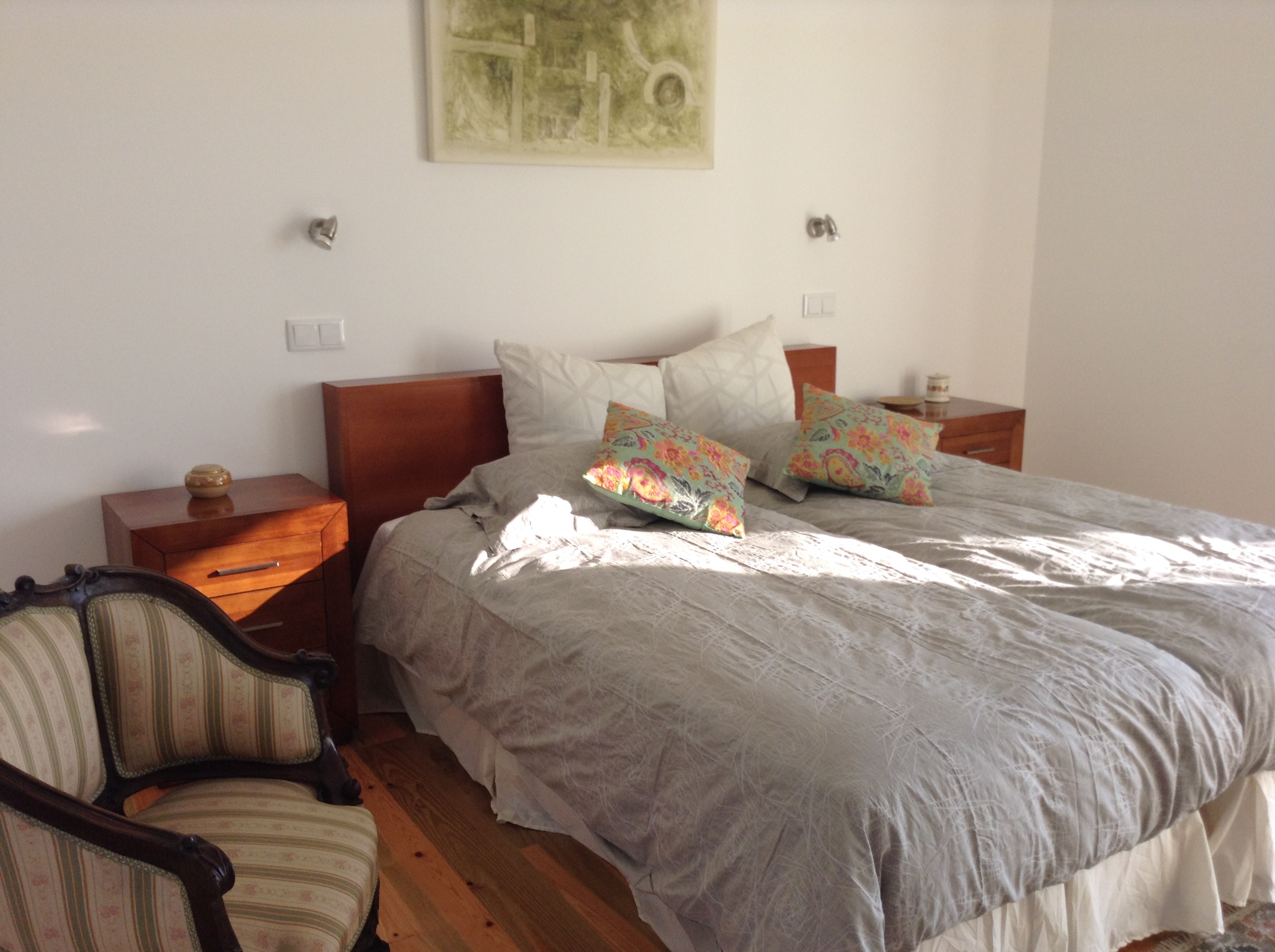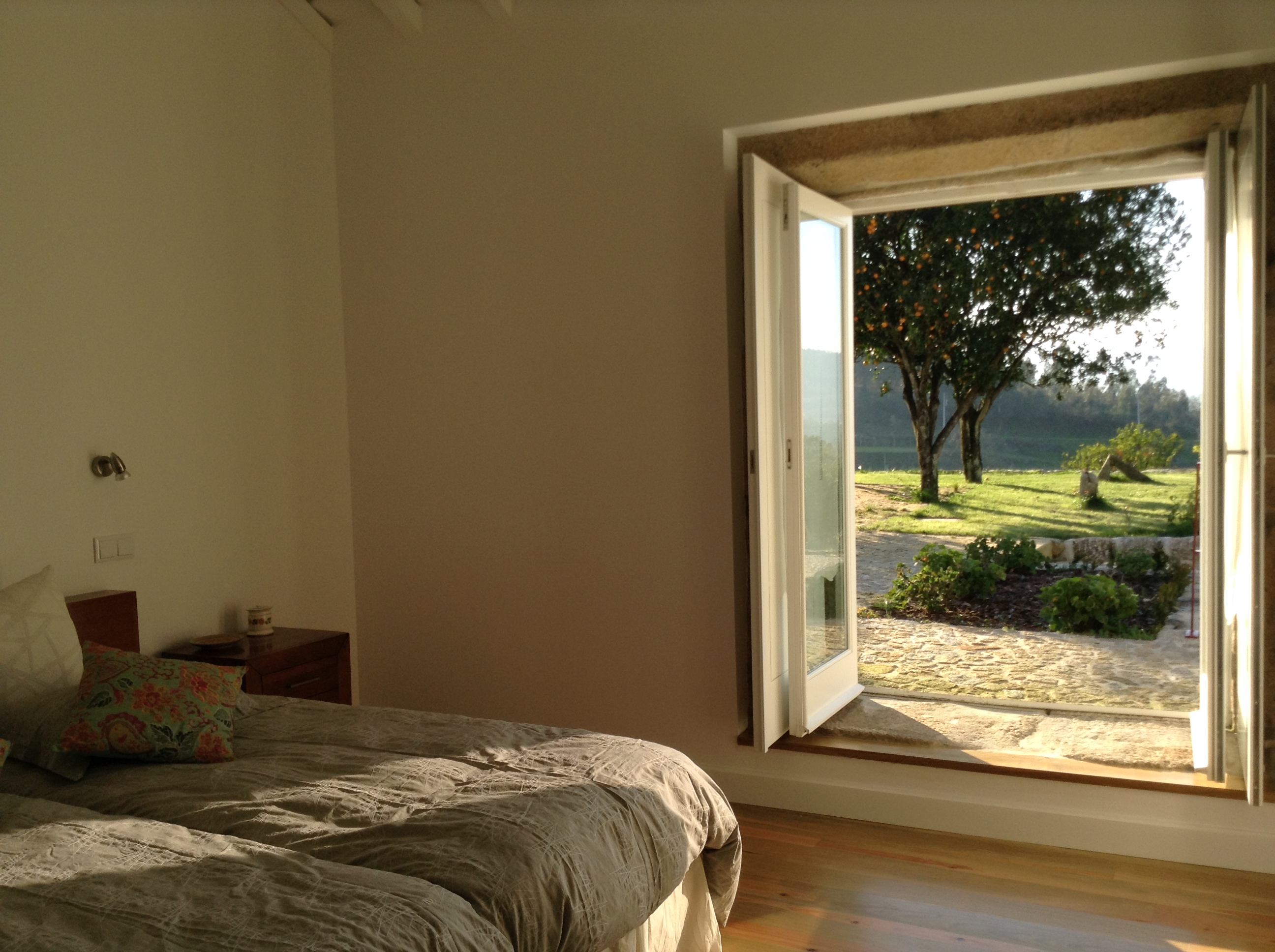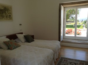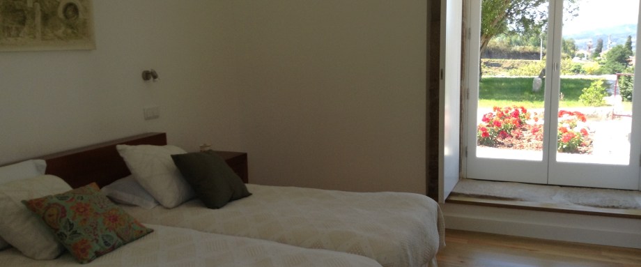 Quarto das Flores Quarto com largas portadas, nascente e poente, que deixam entrar os aromas e o colorido das flores dos jardins envolventes da casa. Quarto equipado com quarto de banho privativo, vestiário, aquecimento, televisão e acesso wi-fi gratuito.